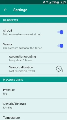 You can: - Calibrate the sensor - Enable automatic periodic pressure recording - Choose different barometric units (hPa, mbar, mmHg, inHg, psi)